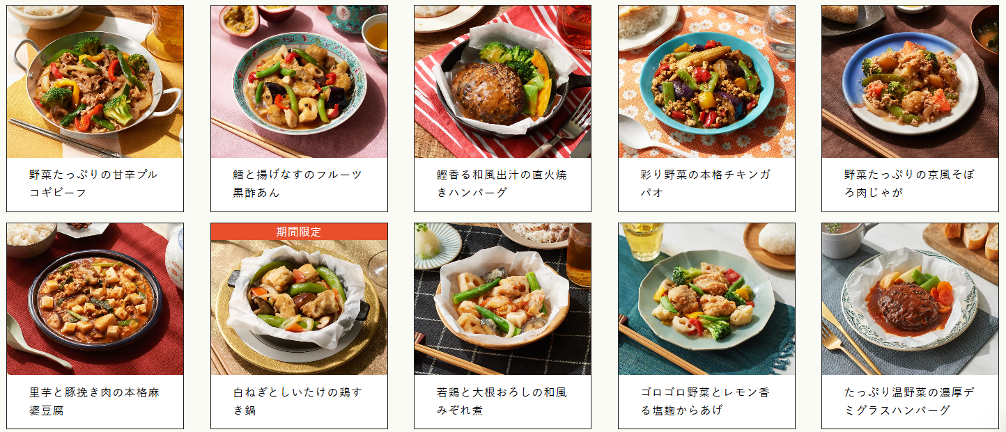 メニューは和洋中と幅広く、定期的に新しいメニューが登場するので、飽きることがありません。人気なのは、鶏肉やきのこがたっぷり入った「鶏肉とゴロゴロ野菜のバター醤油煮込み」や、ピリ辛で食欲をそそる「ひき肉とナスのアジア風炒め」など、野菜が主役なのにメインディッシュとして満足感の高いメニューです。